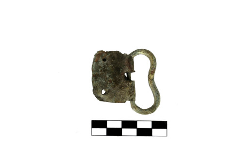 Fibbia di cintura con anello a sagoma ovale con strozzatura in corrispondenza dell'appoggio dell'ardiglione, a sezione circolare, doppia placca in lamina ripiegata di forma quadrangolare con due fori, agli angoli esterni, per i chiodini di fissaggio alla fascia di cuoio.