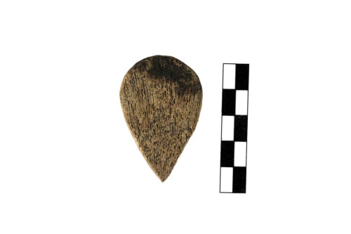 Applique, forse per decorare cofanetti di legno, in osso lavorato, sottile, a forma di goccia, su una faccia restano tracce del tessuto midollare, dallaltra losso è levigato. Tracce di fuoco su una faccia.