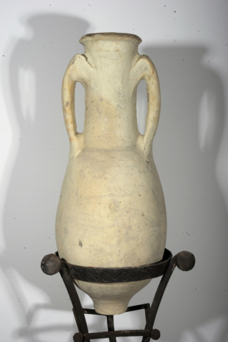 Anfora con orlo sagomato a corolla, collo cilindrico lungo e ampio, corpo ovoidale con ventre abbassato, anse a sezione ovoidale con gomito stretto, a punta, impostate al di sotto dellorlo, scendono spioventi sulla spalla, leggermente curvilinee, spalla sottolineata da un gradino.
