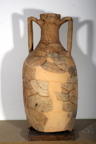 Anfora con orlo ad anello rilevato, collo lungo e cilindrico, corpo ovoidale, anse a doppio bastone, leggermente apicate, impostate al di sotto dellorlo, scendono leggermente spioventi sulla spalla sottolineata da uno spigolo.