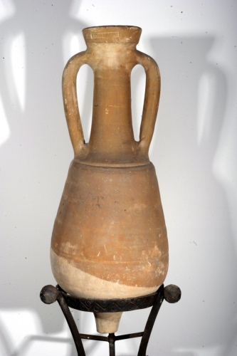Anfora con orlo a fascia distinto da un gradino dal collo lungo e cilindrico, corpo piriforme, spalla obliqua segnata da un anello all'attacco del corpo, puntale corto e pieno, anse robuste con gomito arrotondato e sezione ovoidale, impostate al di sotto dellorlo, scendono leggermente spioventi sulla spalla.