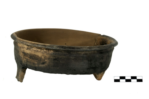 Tegame su tre piedi (tripus) con orlo estroflesso, ingrossato sottolineato esternamente da larga gola circolare, pareti verticali, vasca troncoconica, fondo piano, gambe a sezione rettangolare con base di appoggio costituita da tre piccoli peduncoli.