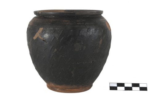 Boccale con orlo ingrossato, estroflesso, concavo allinterno e stretta gola esterna allattacco con la spalla, quest'ultima decorata con sottili linee orizzontali concentriche incise, corpo ovoidale decorato da sottili spine oblique a barbottina, piede ad anello.