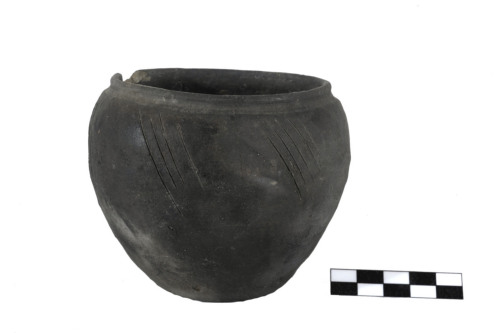 Bicchiere a pasta grigia, a larga imboccatura con orlo ingrossato e gola esterna allattacco con la spalla, corpo ovoidale panciuto decorato nella parte alta con fasce di 4 o 5 linee incise a crudo, oblique e parallele, fondo piatto.