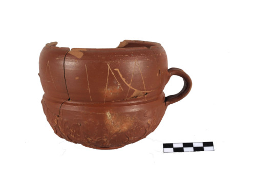 Sul bordo è graffito, dopo la cottura, con tratto poco profondo e sottile, il marchio a grandi lettere ATIM ATI. Marchio leggibile come Atimetus oppure Athimetus. Quest'ultimo è un vasaio attivo in area padana tra il 10 a.C. e il 15 d.C., cognomen di origine greca molto frequente in Italia a partire dalletà imperiale. La produzione di Athimetus si concentra nella Venetia (Altino, Aquileia, Concordia Sagittaria), con rare attestazioni in Aemilia, Transpadana e Noricum. Invece Atimeti è frequente per lo più in area polesana tra età augustea e inizio del II sec. d.C.