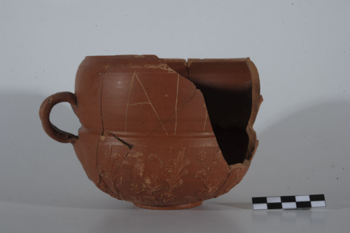 Coppa ad alto bordo convesso, tipo Sarius, con orlo rientrante, assottigliato, sottolineato da una scanalatura esterna, corpo emisferico, decorato a matrice, piede ad anello con fondo concavo, ansa a nastro con leggera costolatura centrale, impostata a metà del bordo e sulla spalla, subito sopra la fascia decorata, sul lato opposto, rimangono i due attacchi dell'altra ansa. Fascia decorata con una teoria di palmette, verticali, a 7 lobi, sorgenti da una foglia di edera; tra una palma e l'altra si alternano una grande foglia di quercia sorgente da un cespo di foglie, in alto, ai suoi lati, due rosette a sei petali, alternata ad un'aquila, ad ali spiegate con le zampe rivolte verso d. e la testa verso s., al di sotto, teoria di fiori a sette petali e coroncine.
