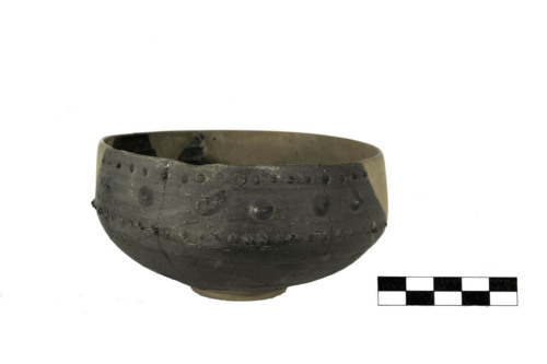 Coppetta con carena a circa metà della parete e al di sopra della carena le pareti si inclinano leggermente verso linterno, orlo indistinto e assottigliato, basso piede a disco con fondo leggermente concavo e verso l'attacco del piede, cerchi concentrici incisi. Parte superiore della parete esterna con decorazione a barbottina costituita da due file orizzontali di bugnette appuntite, al centro delle quali è una fila di bugne appuntite più grosse. Leggera sabbiatura sulla superficie esterna ed interna.