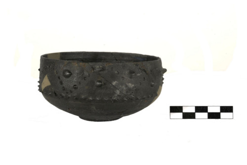 Coppetta con carena a circa metà della parete e al di sopra della carena le pareti si inclinano leggermente verso linterno, orlo indistinto e assottigliato, basso piede a disco con fondo leggermente concavo e verso l'attacco del piede, cerchi concentrici incisi. Parte superiore della parete esterna con decorazione a barbottina costituita da una fila di archi a bugnette appuntite chiusi in basso da un'altra fila orizzontale di identiche bugnette, mentre al centro degli archi e tra un arco e laltro sono bugne appuntite più grosse. Leggera sabbiatura sulla superficie esterna ed interna.