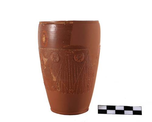 Bicchiere, tipo Aco, con corpo troncoconico, con alto bordo liscio convesso terminante in un orlino estroflesso, sottolineato allesterno da una scanalatura, fondo piano distinto allesterno da una scanalatura, così da ottenere un piccolo piede ad anello. Decorazione costituita da linee verticali irregolari di puntinature (con punti a triangolo) a rilievo intersecantesi in alto e in basso a formare un reticolo di rombi, ai vertici dei quali sono dei fiorellini a girandola, mentre tra i rombi in alto sono grandi margherite.