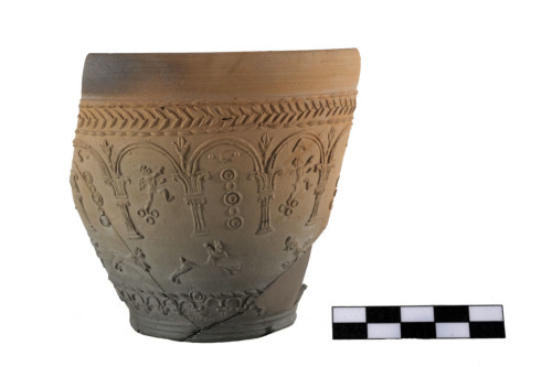 Bicchiere, tipo ACO, con corpo troncoconico a pareti appena ricurve, orlo assottigliato, fondo piano, distinto allesterno da scanalature concentriche, così da ottenere un piccolo piede ad anello. Decorazione sul corpo costituita da quattro registri: subito sotto l'orlo, giro di chiusura con corona di foglie entro cornice a cordicella, al di sotto è una serie di archi a doppia linea e a doppio ordine di colonnine a capitello composito, nell'imposta è un motivo vegetale; entro gli archi restano le lettere (punto) C (punto) A C[-]S (punto); sotto gli archi si alternano una fila di cinque cerchi, disposti verticalmente, dei quali tre, più grandi, costituiti da due cerchi concentrici e due, più piccoli, ad un solo cerchio, e un erote che salta verso d., sotto il suo piede d. sono tre cerchi, disposti a triangolo con vertice verso il basso; al di sotto della serie degli archi è una sequenza semplice di erote, cane, cervo nell'atto di correre verso d. e gallo verso s.; infine, in basso, in prossimità del piede è un motivo a cordicella inframezzate da spirali, in basso teoria di archetti desinenti in fiore gigliato.