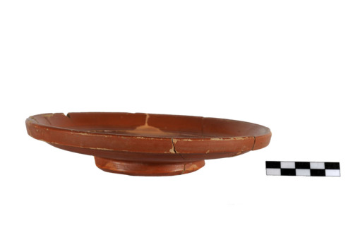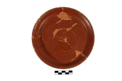 Piatto con parete bassa e svasata, orlo, estroflesso, pendente verticale e sottolineato internamente da una solcatura circolare, piede ad anello troncoconico con spigolo vivo. Allinterno del piatto, cerchi concentrici incisi, al centro, bollo in cartiglio rettangolare in due righe (TH)YRSVS/(PL)(AE)TORI.