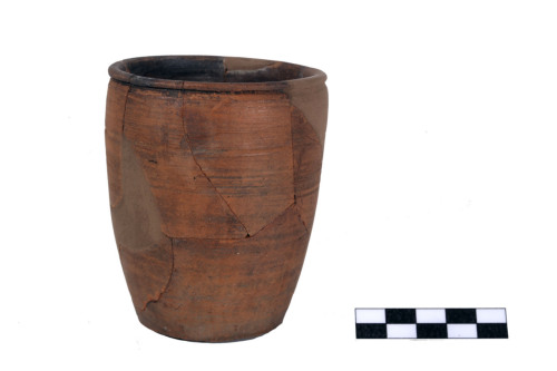 Bicchiere con corpo leggermente ovoide, piccolo orlo estroflesso, piatto superiormente e sottolineato da profonda gola esternamente, fondo piatto con traccia di arco inciso, sulla spalla scanalatura circolare e in basso tracce di cerchi concentrici incisi.