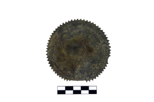 Corpo dello specchio costituito da una lamina circolare, piatta, decorata sulla faccia interna da cerchi concentrici incisi e da solcature, esternamente da una solcatura lungo il bordo. Il bordo è tagliato in modo da formare un circolo di dentelli appuntiti, spazio tagliato in modo rettilineo, privo di dentelli, per lalloggiamento del manico.