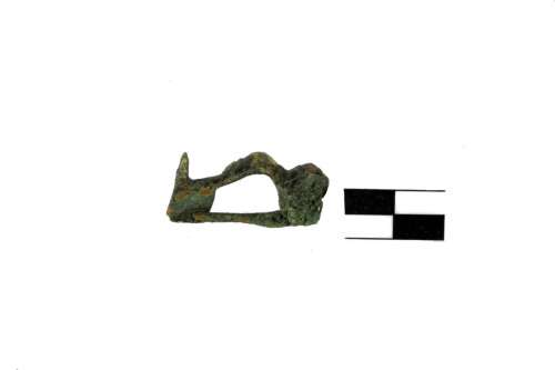 Fibula a molla, del tipo kräftig profiliert", con arco fortemente profilato a sezione lenticolare, staffa piena di forma rettangolare, a T, con terminazione a uncino.