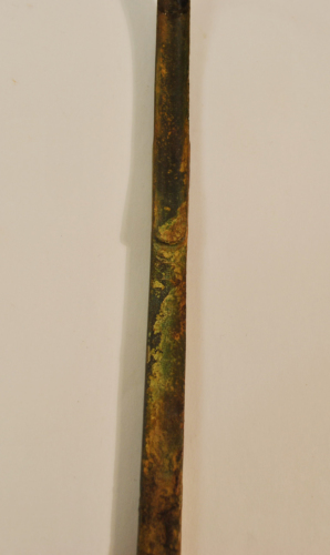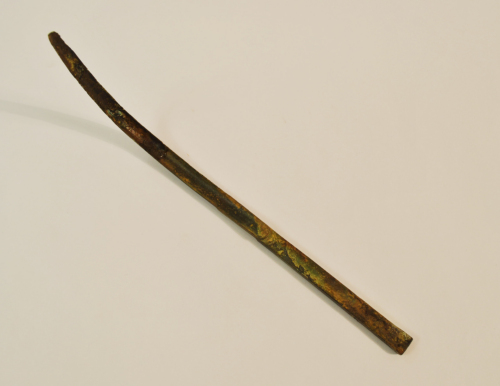 Strigile con capulus (manico) parallelepipedo, pieno, liscio, a sezione rettangolare con alette laterali aderenti ai margini della ligula (cucchiaio) e decorato da due linee incise, sui lati lunghi. La ligula presenta allinterno, nel punto di attacco con limpugnatura, una terminazione semicircolare prominente. Sulla faccia interna dellimpugnatura, vicino allattacco con la ligula, due bolli impressi a lati concavi a formare una T e con segni illeggibili all'interno di ciascun bollo, probabile marchio di fabbrica o di proprietà. La ligula è incurvata quasi ad angolo retto, terminante a punta e superiormente decorata da una costolatura centrale e da due leggere laterali.