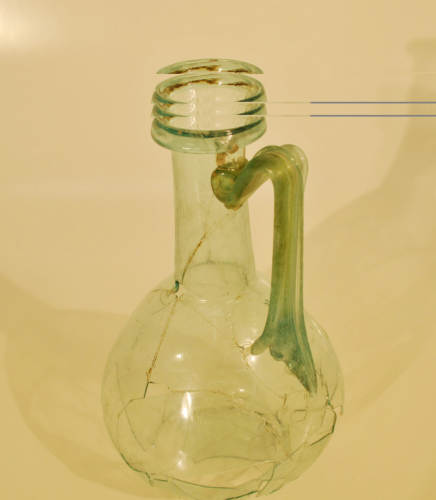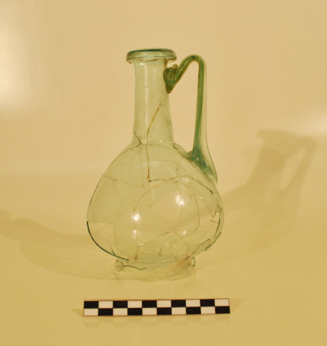 Bottiglia con orlo ribattuto pendente a profilo obliquo, lungo collo cilindrico, sottolineato alla base da una leggera strozzatura, ansa a nastro a due nervature con costolatura centrale molto pronunciata e che scende più in basso rispetto allattaccatura laterale sulla pancia, piegata ad angolo acuto, corpo piriforme, piede ad anello, piuttosto rigonfio, ricavato dalla base e fondo leggermente concavo.