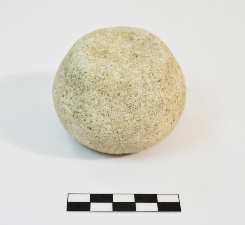 Peso in pietra grigiastra, probabilmente calcarea, di forma sferica decalottata, la superficie inferiore è leggermente concava, su quella superiore, piatta, vi sono due fori circolari allineati orizzontalmente, destinati a ricevere un manico in ferro di cui si conservano i grumi. Anche il manico contribuiva a determinare il peso nominale delloggetto. Vicino al peso di 1 libra = 327,45 gr.