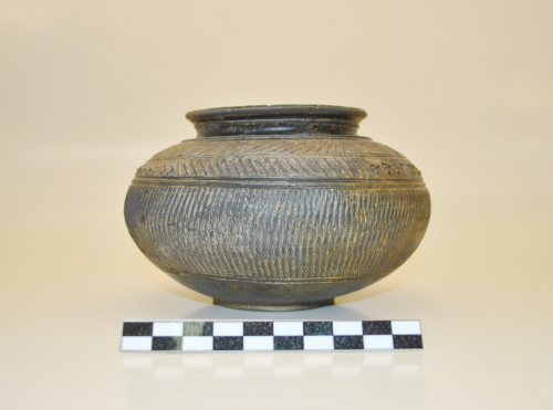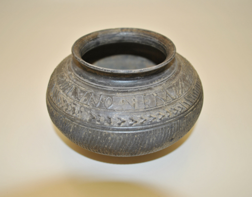 Vaso a pareti sottili con corpo globulare schiacciato, bocca con orlo estroflesso e labbro obliquo, breve collo concavo con costolatura centrale, e alla base, sporgente listello. Piede ad anello con cerchi concentrici incisi. Sulla spalla è una fascia delimitata, in basso e in alto, da due incisioni circolari, nella quale è l'iscrizione a barbottina e una impressione a rilievo a linee oblique verso d.; al di sotto è un'altra fascia delimitata da due incisioni circolari e una impressione a linee oblique verso s. e a freccette a barbottina con punte verso d.; la pancia è decorata da una fitta rotellatura di lineette incise trasversali delimitata da doppie incisioni circolari. Tracce di impronte digitali in prossimità del piede.