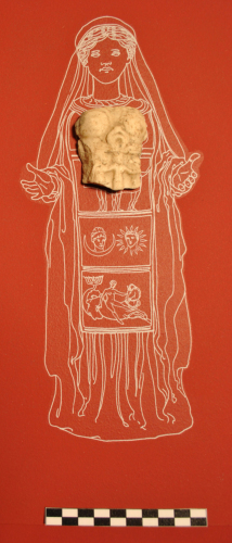 Scheggia di marmo con l'effigie a bassissimo rilievo di un busto femminile. Lungo la frattura superiore del frammento sono scolpite quattro piccole sfere pertinenti ad una collana, in basso due calotte circolari a protezione dei seni, tra le quali è un grande pendente a forma di crescente lunare appeso ad un nastro; al di sotto del pendente e del seno s. è parte di una cintura con solcatura mediana. Questa segna il margine superiore di un fascia nella quale sono scolpite le tre Grazie, conservate solo parzialmente.