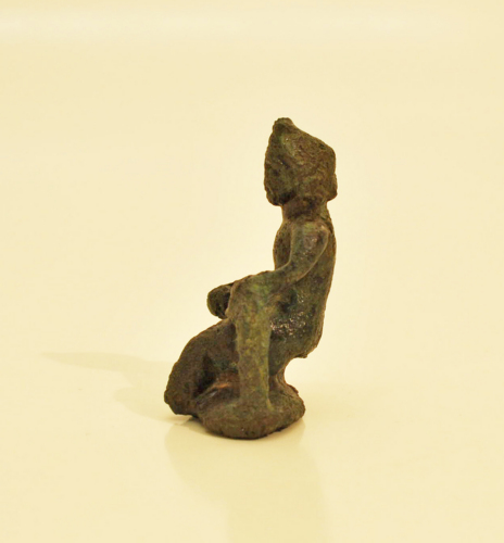 Statuetta raffigurante Arpocrate seduto, con base di forma ovoidale. La figura è nuda, seduta forse su una roccia, il volto infantile è cinto dalla folta capigliatura che scende in lunghi riccioli sul collo e alcune ciocche sono annodate alla sommità del capo, con la s. regge forse una cornucopia o un fiore (?), la gamba d. è piegata, mentre la mano s. è appoggiata sulla testa del serpente che ha parte del corpo sollevato, alla s. del dio. Al di sotto della base vi è un foro circolare.