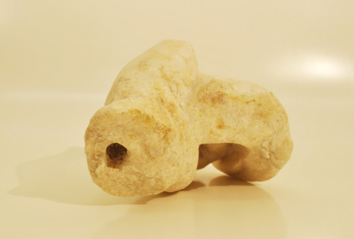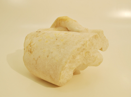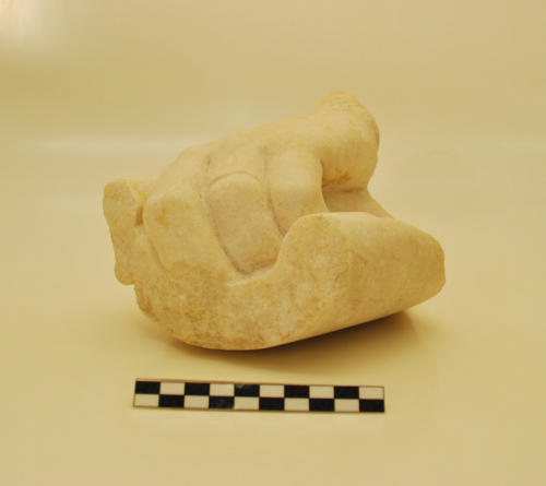 Grosso frammento di mano s. con anello con grande castone piatto, ovale allanulare, regge forse un volumen, il pollice e lindice stringono il bordo rotondo, il mignolo è piegato verso linterno. Polso non levigato, sbozzato, con foro centrale per alloggiamento della staffa.