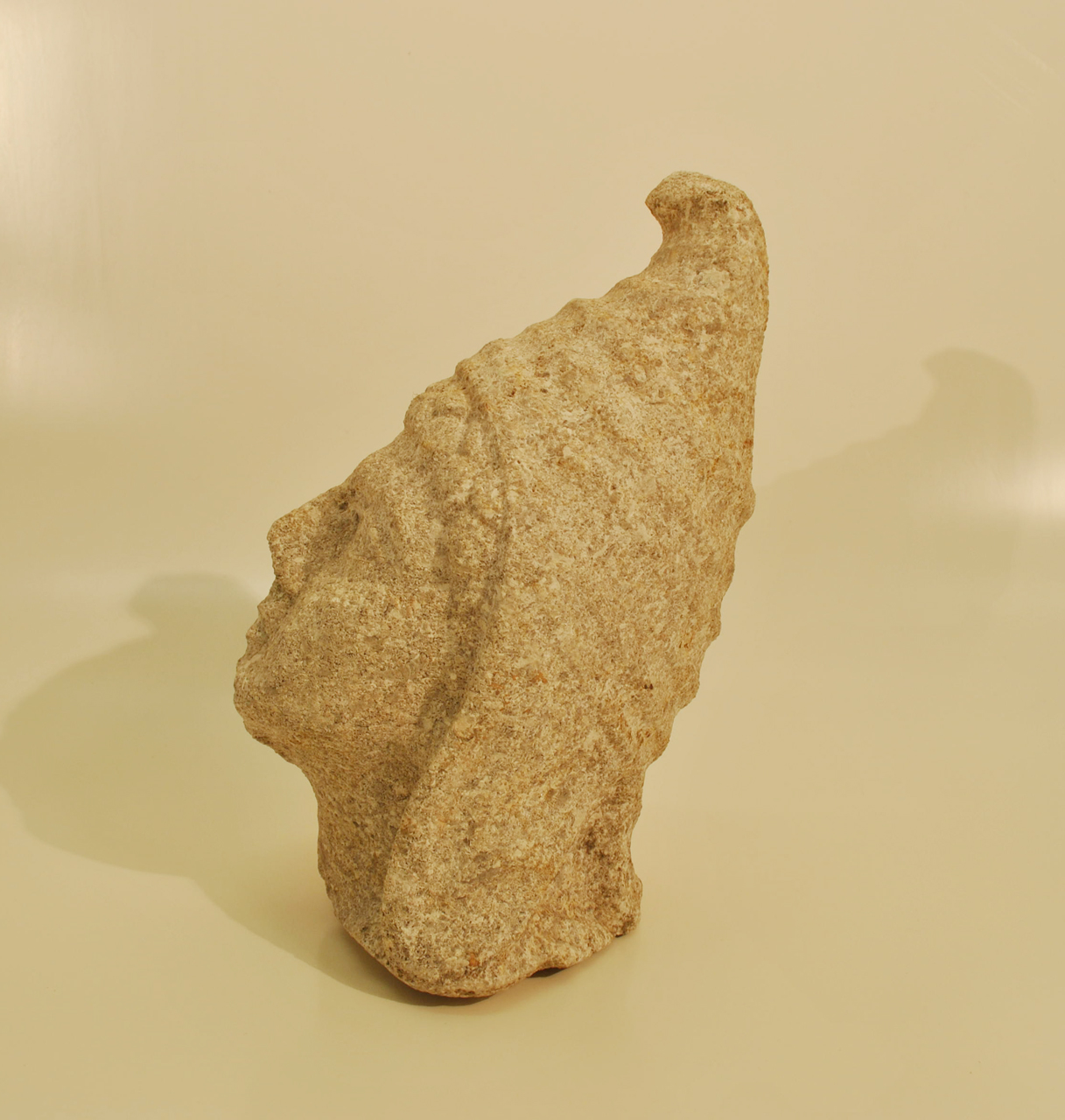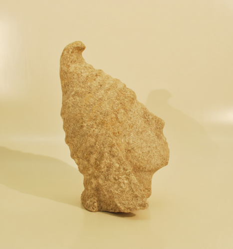 Testa di Attis con copricapo a punta ripiegata e piegature sulla testa e sulla nuca, il copricapo scende, con bande laterali, sulle orecchie fino alla base del collo, corona di riccioli sulla fronte, occhi grandi, naso a punta, piccola bocca e mento rotondo.