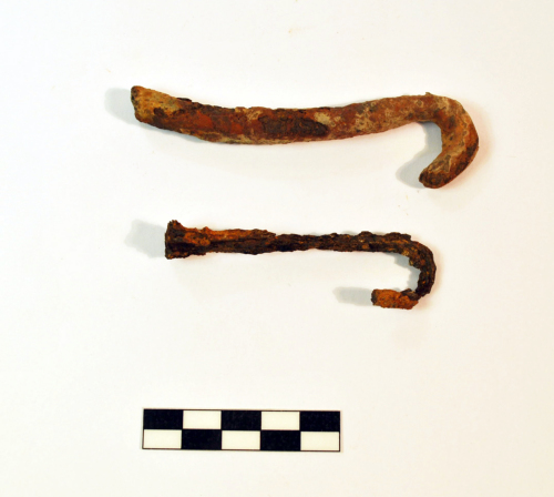 Due ganci con punta incurvata: uno con stelo a sezione circolare un po’ incurvato ad S, l’altro a sezione pseudo quadrangolare.