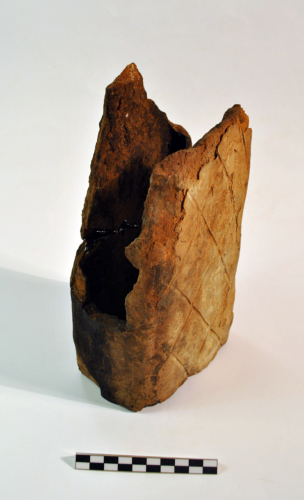 Tubulo di forma parallelepipeda, sui lati corti apertura rettangolare a 8,5 cm di altezza, spigoli curvi, superfici superiori piatte con incisioni a crudo a reticolo, tracce di fuoco soprattutto internamente.