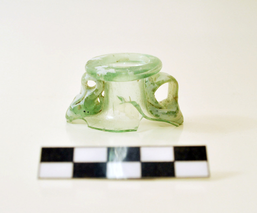 Aryballos con labbro orizzontale ribattuto, breve collo cilindrico, due anse a nastro chiuse ad anello e saldate subito sotto lorlo e sulla spalla, probabile corpo sferico.