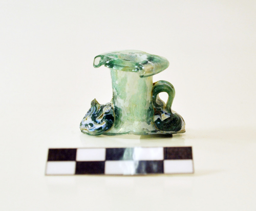 Aryballos con labbro orizzontale ribattuto, breve collo cilindrico, due anse a nastro chiuse ad anello e saldate subito sotto lorlo e sulla spalla, probabile corpo sferico.