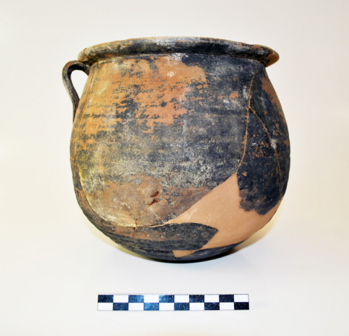 Olla con corpo globulare con ventre ribassato, orlo a tesa leggermente inclinata verso lalto e leggermente concava superiormente, ingrossata all'estremità, fondo convesso, due piccole anse ad orecchio, impostate subito sotto lorlo e sulla spalla e a sezione ellittica, sulla parete esterna del corpo fitte scanalature parallele da tornio. Questa forma costituisce la quasi totalità dei rinvenimenti in ceramica comune da cucina a Corte Cavanella.