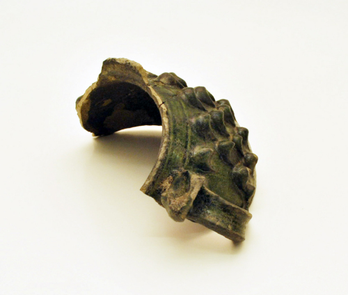 Frammento di coppa biansata con orlo inclinato verso lesterno e depressione interna, parete a profilo curvilineo con ventre ribassato, ansa ad S con attaccatura sotto lorlo ripiegata verso linterno e schiacciata, depressione manuale lungo la superficie esterna, impostata sotto lorlo e su metà del corpo, parete con decorazione a barbottina di scaglie di pigna molto pronunciate e subito sotto lorlo due leggere linee concentriche incise.