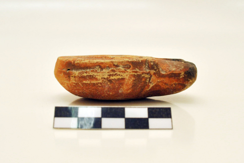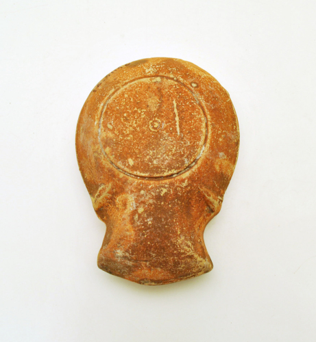 L'argilla è di colore beige, la vernice è rosso bruna a chiazze più scure, beccuccio annerito dal fuoco.