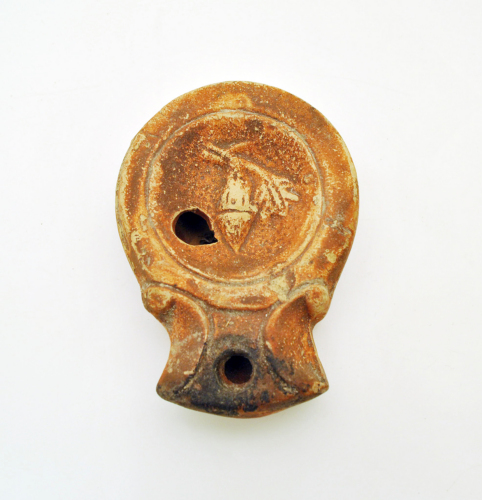 Lucerna a volute con spalla larga e piatta delimitata da una solcatura, sul disco a pareti concave è raffigurata in rilievo un ramo di quercia con foglia e ghianda, ramo inclinato con una protuberanza, a s. del ramo è linfundibulum, base circolare piatta delimitata da circonferenza incisa entro cui è al centro un cerchietto con punto centrale impresso e accanto ad esso, sulla d., è la lettera I in rilievo; senza foro di sfiatatoio, becco a volute a bottoncino rotondo, molto largo nella terminazione e punta triangolare quasi piatta. Il tipo di figurazione è diffuso nel Nord-Italia, in Rezia, in Norico, in Pannonia e in Dacia, dall'età flavia al II sec. d.C.