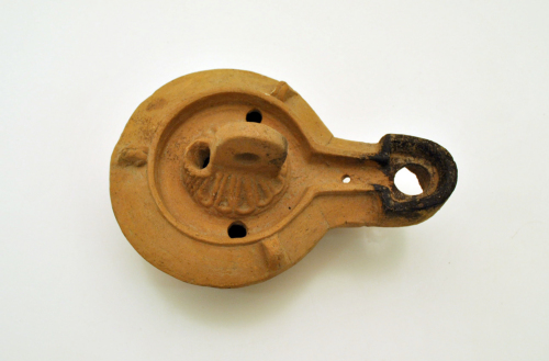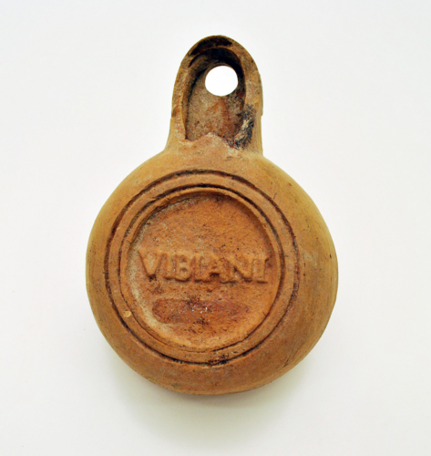 Lucerna "firmalampen" a canale aperto, spalla larga inclinata verso il basso decorata da tre borchietta di forma tronco-piramidale con linea incisa al centro, lanello in rilievo delimitante la spalla prosegue lungo il beccuccio fino al foro di bruciatura delimitando allinterno un ampio canale nel quale al centro è un foro di sfiato, mentre due infundibula sono disposti orizzontalmente e ai lati nel disco, mentre la parte centrale del disco è decorata da fitte baccellature e si innalza formando al culmine un archetto con foro per la sospensione, in asse con questo archetto è un altro infundibulum sulla sommità, base delimitata da due solcature concentriche, allinterno delle quali è impresso il bollo VIBIANI. Tipo diffuso in Italia settentrionale e nelle province centro-settentrionali.