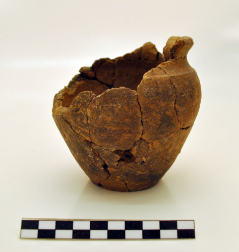 Olletta con orlo appiattito obliquo verso lesterno, labbro estroflesso, breve collo distinto da lieve carena, corpo ovoide, fondo piatto, tracce di annerimento sulla parete esterna, superfici scabre.