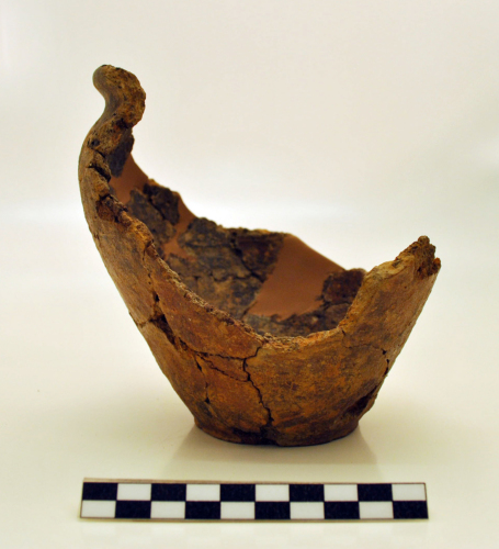 Olletta con orlo appiattito obliquo verso lesterno, labbro estroflesso, breve collo a pareti concave, corpo ovoide, fondo piatto, tracce di annerimento sulla parete esterna, superfici scabre.