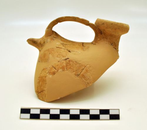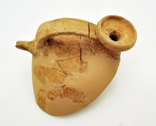 Askos otriforme acromo con orlo alto, arrotondato, inflesso, ansa a nastro, a sezione rettangolare con due solcature incise ai lati, sotto lansa beccuccio cilindrico.