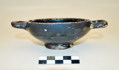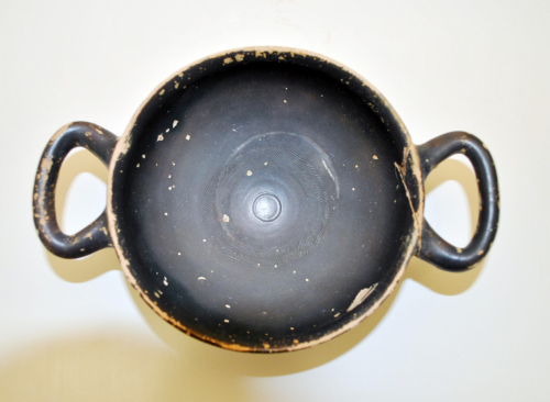 Kylix con orlo assottigliato, vasca carenata, piede ad anello, anse a bastoncello, orizzontali e non ripiegate ad orecchio, sul fondo del piede, non verniciato, pronunciato umbone di tornitura. Allinterno della vasca al centro, cerchiello impresso e quattro giri concentrici di rotellature a trattini obliqui verso s., incisi. Sul fondo esterno del piede una X graffita a crudo.