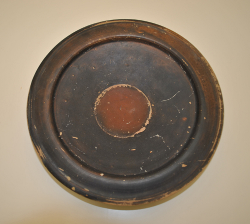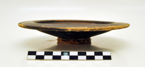 Piatto con labbro a tesa a profilo ondulato, convesso-concavo, vasca poco profonda a pareti interne concave, pareti svasate a profilo rettilineo e carenato in prossimità della tesa, concava allinterno, piede modanato a spigolo acuto, tracce di cerchio inciso in prossimità del piede, sul bordo piatto, esterno, del piede, due tacche incise una da una parte laltra dall'altra, perfettamente in linea orizzontale.