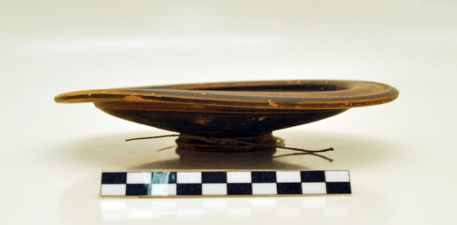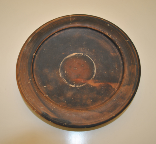 Piatto con labbro a tesa a profilo ondulato, vasca poco profonda a pareti interne leggermente concave, pareti svasate a profilo rettilineo e carenato in prossimità della tesa, piede modanato a spigolo vivo, tracce di cerchio inciso, in prossimità del piede, sul bordo esterno, piatto del piede, due tacche incise una da una parte laltra dall'altra perfettamente in linea orizzontale, sulla parete interna del piede, tracce di cerchio inciso.