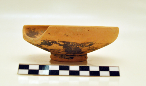 Coppetta con orlo poco rientrante e assotigliato, parete inflessa verso lorlo, piede ad anello a profilo obliquo, sulla vasca interna, al centro, fascia di rotellatura a trattini obliqui incisi verso s., fondo del piede con pronunciato umbone di tornitura e con vernice di colore marrone scuro.