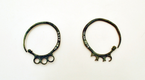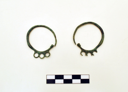 Due orecchini del tipo pinguentino o ad anelli saldati con verga a sezione circolare che si assottiglia verso la punta, tre cerchielli ravvicinati ai quali erano appesi dei pendenti, estremità a bottoncino modanato.