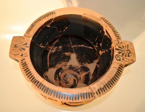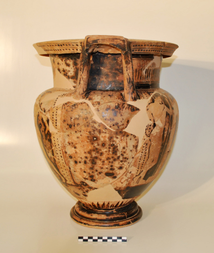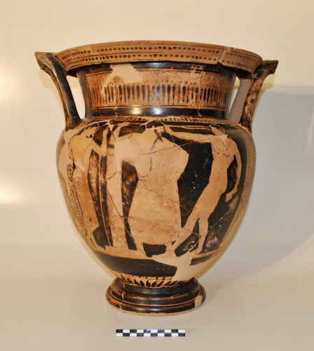 L'interno del cratere è verniciato con vernice nera, lucida. Sull'orlo, fila di boccioli di loto intrecciati, sulle anse, palmetta tra due volute, sul labbro, tralcio d'edera stilizzato, sul collo, campo riempito con boccioli di loto allungati, intrecciati ed inframezzati da punti, il tutto in vernice nero-bruna, opaca. Sul corpo, due scene figurate inquadrate, sopra, da baccellatura, ai lati, da tralcio d'edera stilizzato e sotto, da linea orizzontale, risparmiata. Al di sopra del piede, corona di raggi.