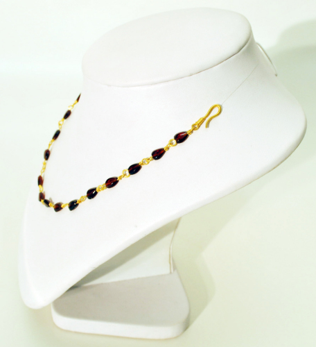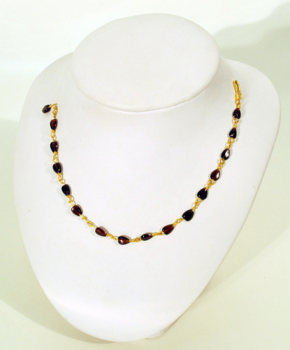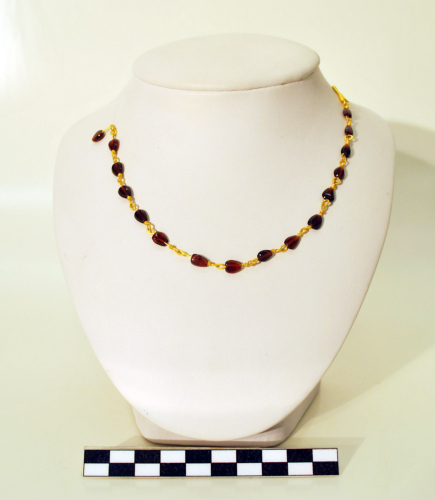 Collana composta da maglie di ca. 1 cm di lunghezza formate da un filo in oro. Ogni segmento di filo ha una estremità chiusa ad anello e una infilata nella gemma e quindi nell'anello della maglia successiva; infine, è avvolto su stesso. La sezione del filo d'oro è appiattita soprattutto in corrispondenza dell'anelllo, più tondeggiante all'altra estremità. Le sedici gemme conservate sono omogenee per colore, dimensione e taglio a forma di cuore. All'estremità di chiusura della collana un segmento di filo aureo forma un gancio che doveva trovare un occhiello funzionale alla chiusura, ora mancante.