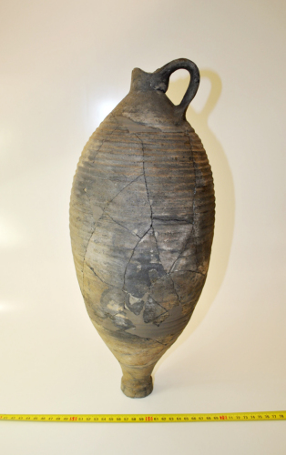 Anfora con collo cilindrico, piccola ansa a nastro, a sezione ovoidale, a gomito arrotondato, con costolatura centrale, impostata sul collo e sulla spalla, corpo ovoide stretto e allungato che si restringe molto inferiormente, pancia decorata da costolature concentriche e parallele orizzontali, piede a disco a pareti rettilinee distinto da un gradino con interno cavo e umbone di tornitura.