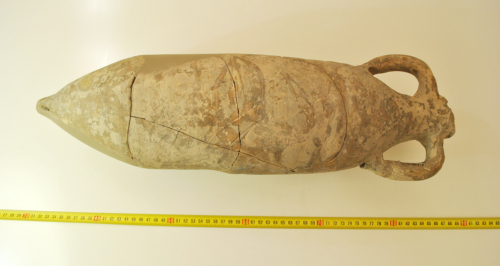 Anfora di piccole dimensioni con corpo fusiforme allungato, breve collo ad imbuto, anse a maniglia, a sezione circolare, impostate sul collo e sulla spalla, fondo a breve puntale conico pieno.