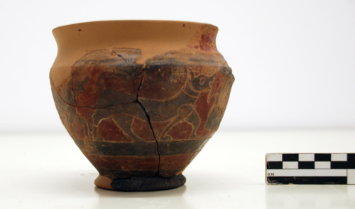 argilla/ a tornio veloce/ rivestimento esterno a vernice rossa e nera/ decorazione a graffito / argilla rossiccia depurata, con diffusi inclusi calcarei di dimensione millimetrica.