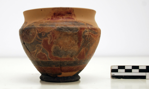 Vasetto con labbro lievemente estroflesso dipinto in rosso, breve spalla dipinta in nero con due solcature orizzontali, corpo troncoconico e basso piede a disco.; rimangono gli attacchi di due anse verticali. Sul corpo, un'alta fascia in rosso con teoria di quattro animali fantastici gradienti verso destra, dipinti in nero e con i particolari a graffito. Sopra il piede, tre basse fasce orizzontali rosse e nere.