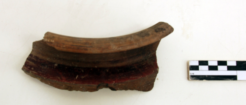 argilla/ a tornio/ rivestimento esterno rosso e nero/ decorazione a fasce / argilla grigiastra semidepurata, con diffusi inclusi micacei e calcarei di dimensione millimetrica.